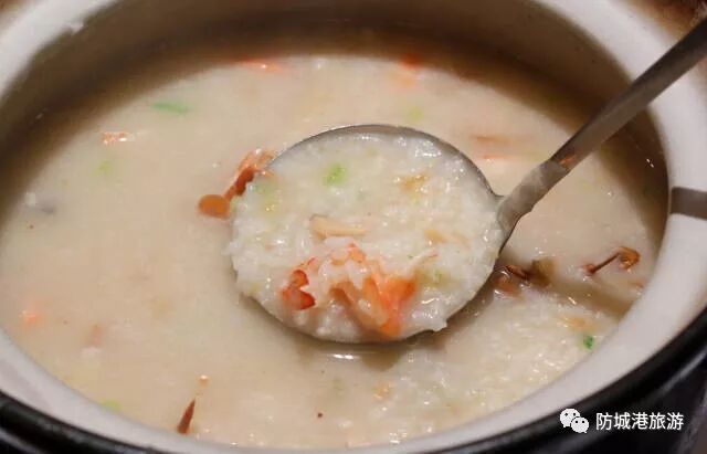 边城东兴,许多年前在国门口岸一带的海鲜粥最为闻名。都打着“天下第一粥”“国门第一粥”“东兴第一粥”的牌子。如今,早搬到其他街巷里去了,但食客们仍闻味而去。当地人的饮食习惯,一年四季,一日三餐,连同消夜——是一日四餐,都有大量的食客喝海鲜粥。海鲜粥以大骨、柴鱼熬成高汤,再配以鱿鱼、海螺、海贝、泥丁、沙虫,此外还加入切碎的猪肉、猪肠、猪腰、猪心、猪肝,并加入香葱、生姜等熬制而成。如稍丰盛一些,还可以叫上几样菜,如烧鸡和煎猪肝、粉肠、瘦肉,炒一碟生菜或菜心之类,便可吃好喝足。这样吃粥,就是吃正餐了。