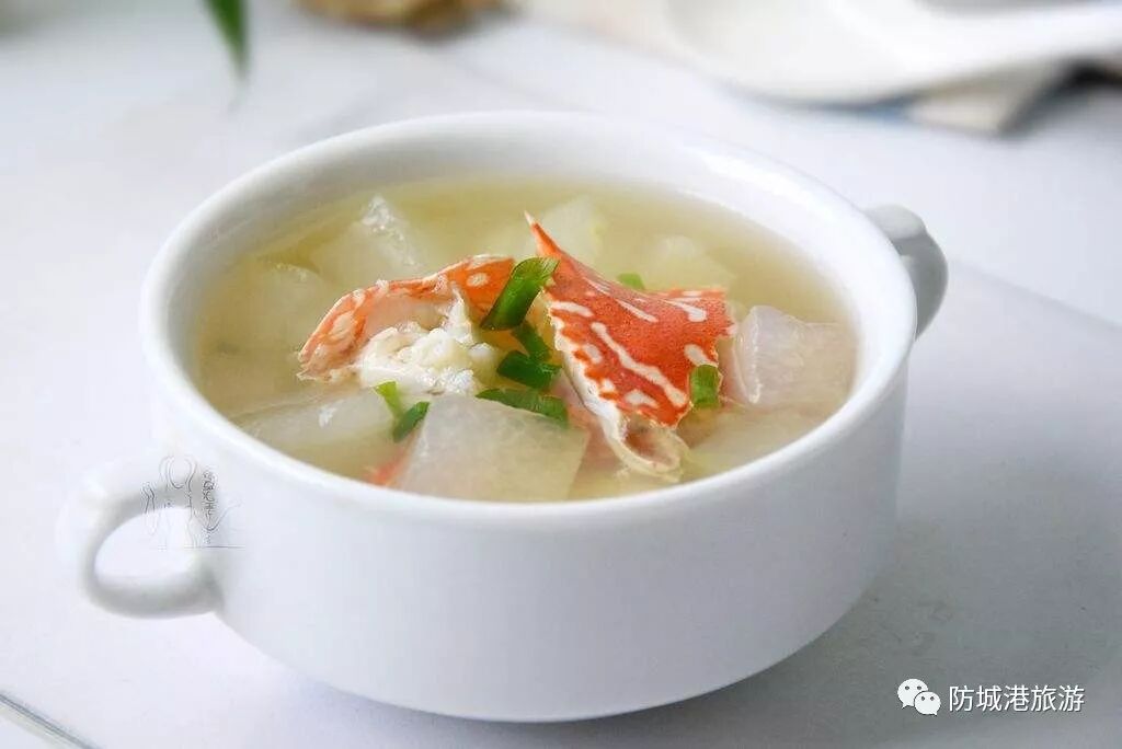 防城港有漫长的夏天,由于天气炎热,青蟹生地汤能活血生津,祛显祛热,治疮疥;冬瓜蟹汤,在炎热的夏天里,也是一道不错消署解渴的食谱。蟹粥也是防城港人欢的小食,每到午夜,街头的小摊档里,青蟹粥、花蟹粥、海鲜粥、泥丁粥等等,一盆热腾腾香味四溢的海鲜粥,令你胃口大开,食欲大增。