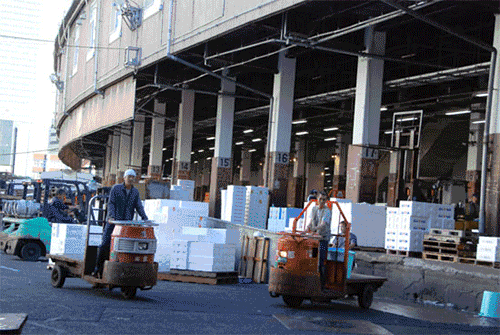 筑地市场早晨的吞拿鱼拍卖非常有名,然而属业界专利,游客可参观「鲔鱼拍卖见学」,但名额很少。5:25am 左右开始的见学,午夜两三点就要前往排队等候了,而且名额有限,实属难能可贵的经验。