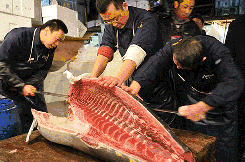 日本人的餐厅开张,甚或近年有婚礼都以「鲔鱼解体」作为一个庆祝仪式,「筑地•山贵水产市场」也预告在特别的时段也会有这项表演,甚至能实时品尝新鲜切下来的鲔鱼呢!