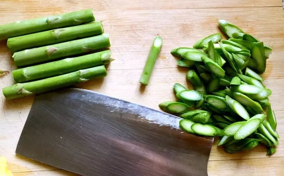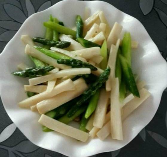 原料:芦笋、茭白。做法:1、芦笋洗净,削去根部的老皮切成段,茭白剥去外皮,切成和芦笋差不多大小的段;2、锅热倒少许油,同时倒入芦笋段和茭白段翻炒;3、淋入一点点水,盖盖焖1-2分钟;4、开盖继续翻炒,调入盐,并淋入少许水淀粉,翻炒至收汁即可。