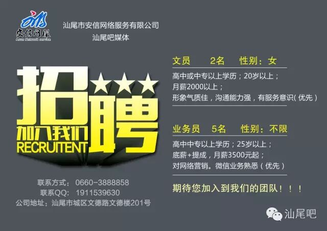 汕尾市安信网络服务有限公司,简称:安信网服,是汕尾市一家集微信服务、网媒服务、网站服务、电商服务、演艺服务、互联网技术研发的综合服务企业。旗下有:汕尾市城区安信网络服务中心、汕尾吧媒体(百度汕尾吧、汕尾吧官网、汕尾吧官微)。
