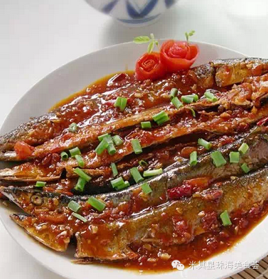 2、.取锅加热炒香切好的番茄碎、姜片和蒜碎、番茄沙司后加入米酒整齐放入秋刀鱼煮开用小火煲2—4小时左右后调味.取出装盘即可。
