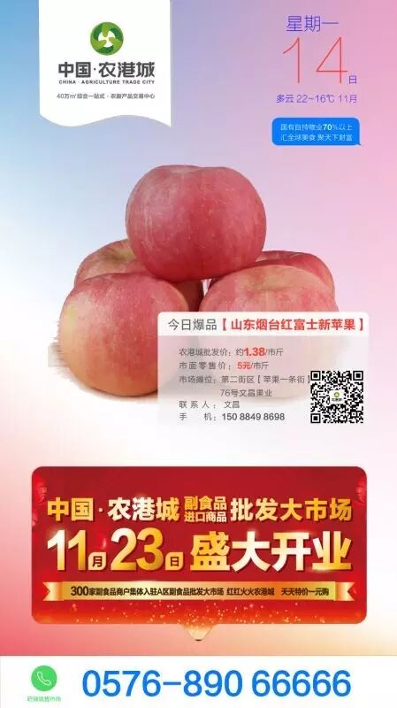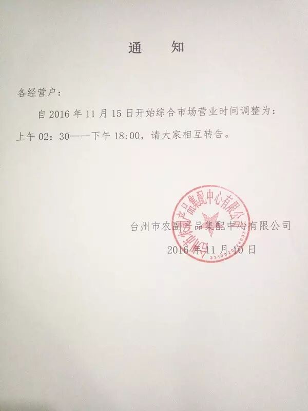 自2016年11月15日开始,农港城二楼综合市场营业时间调整为:上午02:30——下午18:00,请大家相互转告。