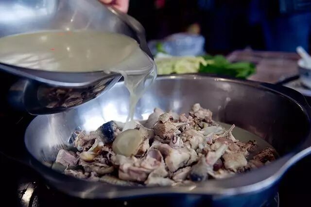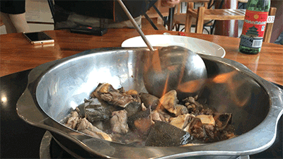 这集营养和美味于一身的上品好汤,无须添加,完全靠释放甲鱼肉内丰富的蛋白质和老母鸡的鲜味。整个火焰甲鱼为先喝汤,后吃肉,再涮菜,如行云流水般的自在美味。鲜汤浓浓的,呈金黄色,汤味醇美,堪称一绝!