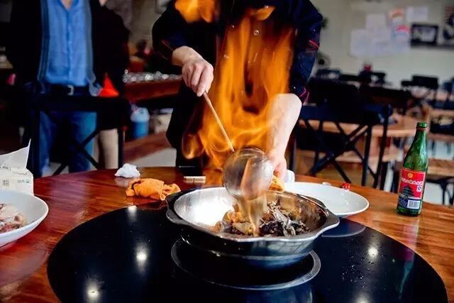 高度酒下锅,大火熊燃,燃烧的火焰甚为壮观,看客们接连发出“呜”、“哇”的声声感叹,而拿着长铁叉的小哥只是淡然一笑,一副早已司空见惯的表情。