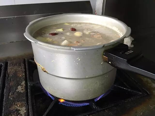 炒制完后将鸡和甲鱼放入高压锅,入党参、桂圆等滋补食材压制10-15分钟方可出菜。