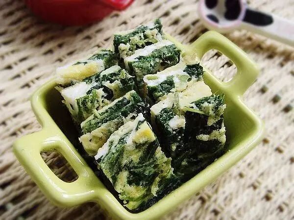 ②要在蛋液未凝固前码入苋菜,在苋菜没煎透前倒另部分蛋液